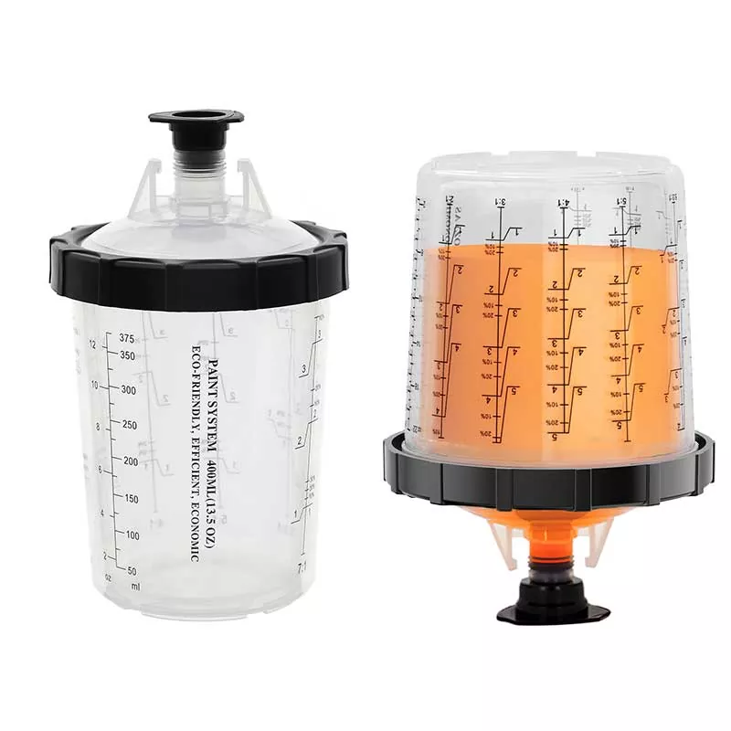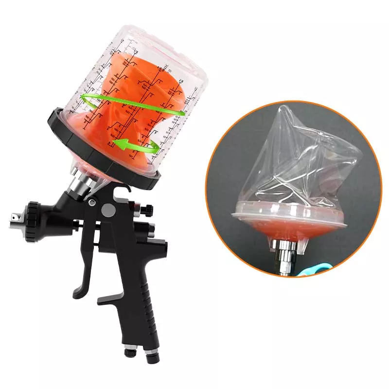 Dieses 400-ml-Einweg-Farbbechersystem 1.0 ersetzt im Grunde den herkömmlichen Schwerkraftbecher, da es nicht nur mehr Farbe spart, sondern auch die Effizienz des Lackierens verbessert. Insbesondere sorgt das exquisite Design der automatischen Abwärtsspirale des Liners beim Lackieren dafür, dass die Farbe vollständig ausgenutzt wird. Dank der Schnellverriegelung und dem Austausch des Liners wird zudem das Auswaschen des Bechers vermieden, sodass die Lackierarbeiten effizient und wiederholt durchgeführt werden können. Wir haben Adapter für fast alle Spritzpistolenmarken auf dem Markt, um den Erfahrungsbedürfnissen verschiedener Spritzpistolen-Enthusiasten gerecht zu werden. Der Adapter besteht aus Edelstahl, der resistent gegen Lackkorrosion und sehr langlebig ist. Die enge Verbindung der Einlage mit dem Deckel stellt sicher, dass beim Lackieren keine Farbe aus dem Bechersystem ausläuft, und unterstützt die langfristige Lagerung ungenutzter Farbe, um Abfall zu vermeiden.