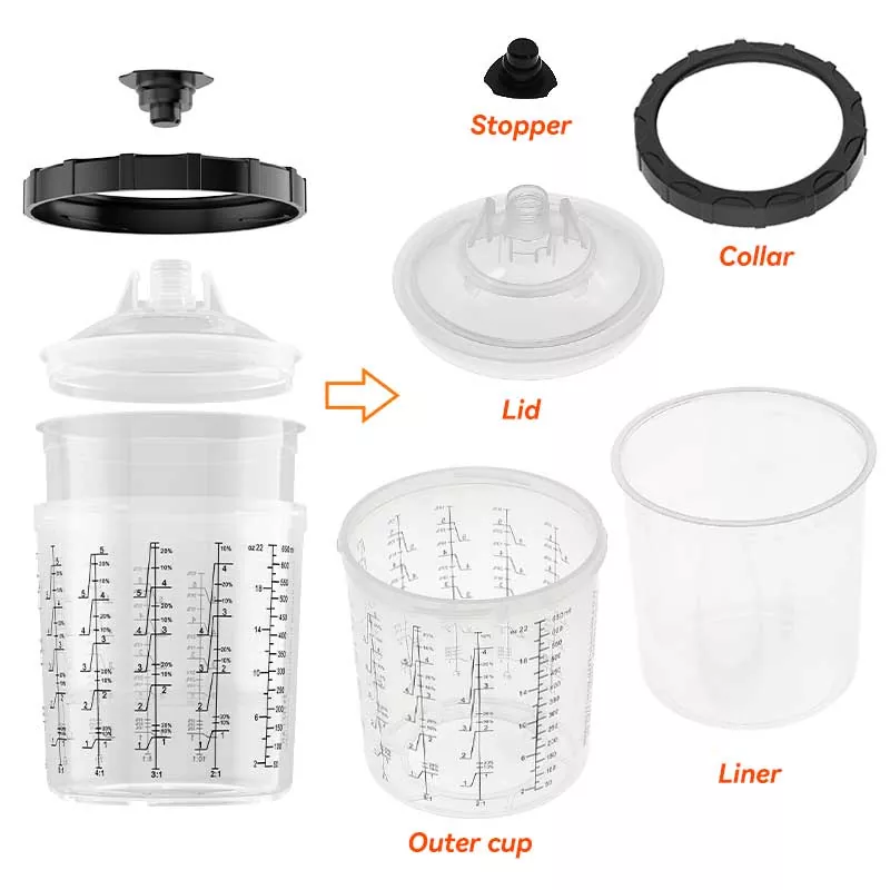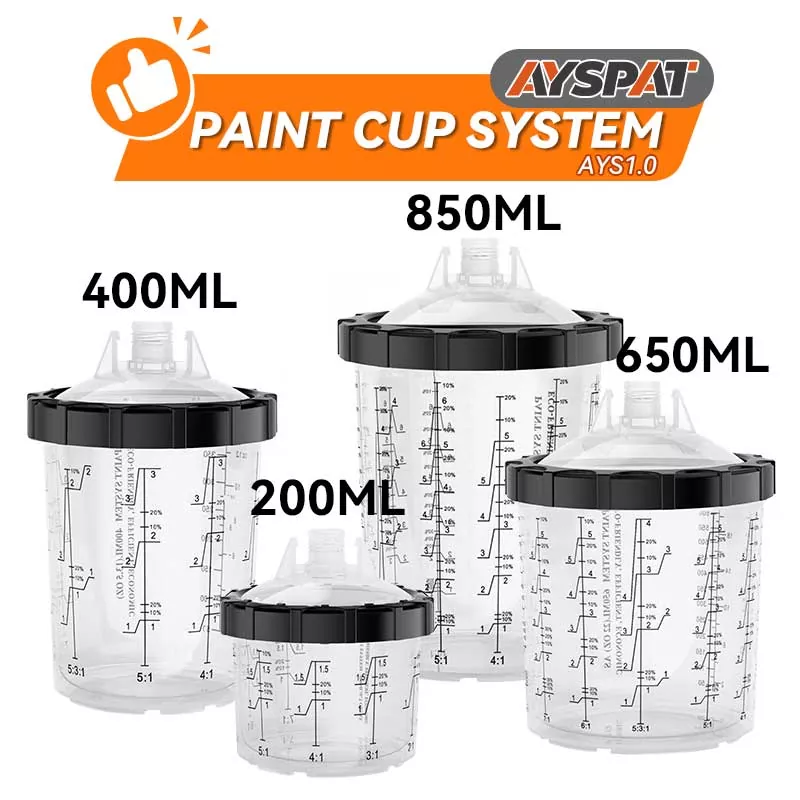 Das 600-ml-Einweg-Farbbechersystem 1.0 ist der vielseitigste Standardbecher, der für Bereiche geeignet ist, in denen 22 fl oz oder weniger Material gesprüht werden. AYSPAT bietet eine Vielzahl von PPS-Bechersystemen mit unterschiedlichen Designs zur Auswahl und kann auch an Ihre Bedürfnisse angepasst werden: Der äußere Becher kann mit Ihrem Markenlogo und Ihrer Skala individuell gestaltet werden, und der Deckel kann mit Farbe und Filtertyp individuell angepasst werden. Wir sind bestrebt, effizientere und praktischere Einweg-Sprühbechersysteme zu entwickeln, um Malern dabei zu helfen, ihre Malerarbeiten professionell und effizient durchzuführen.