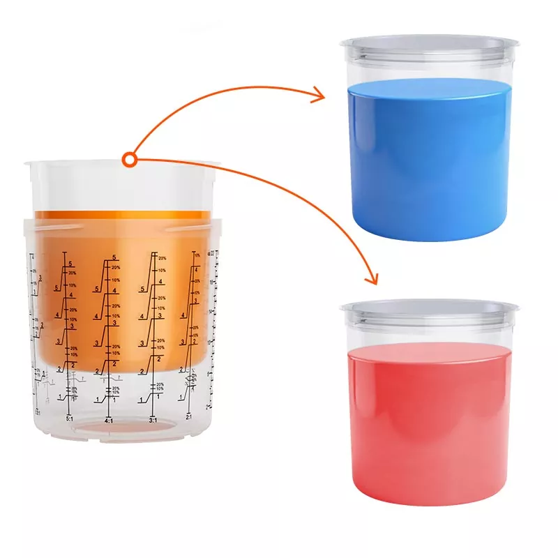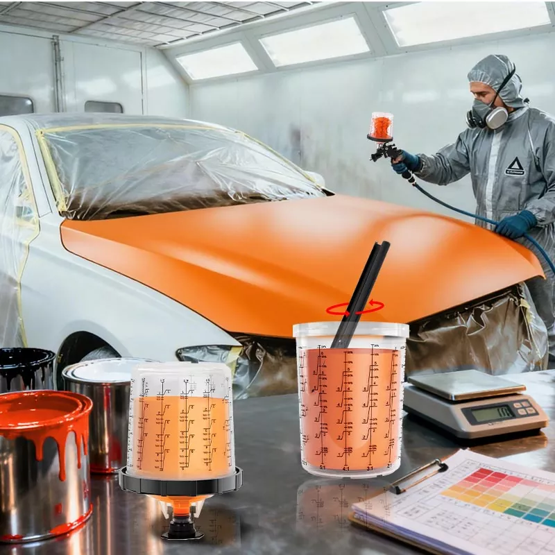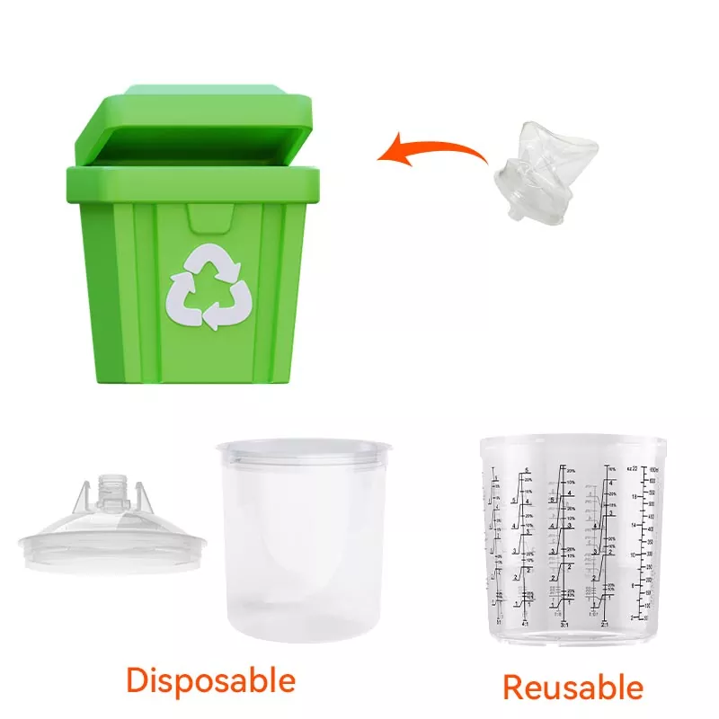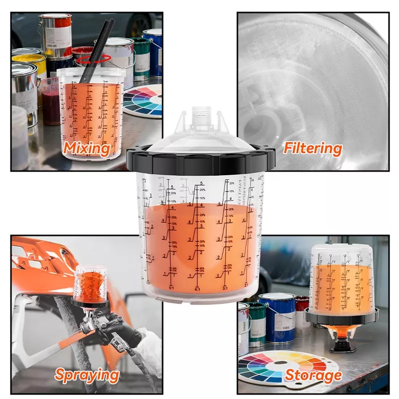 Das Einweg-Farbbechersystem vereint Misch-, Filter-, Sprüh- und Aufbewahrungsfunktionen in einer Einheit. Dies vereinfacht nicht nur die Farbvorbereitung vor dem Auftragen, sondern erspart auch die Kosten für Mischbecher und Papiertrichter, was sie zur perfekten Wahl macht, um Vorbereitungszeit zu sparen und die Sprüheffizienz zu verbessern.