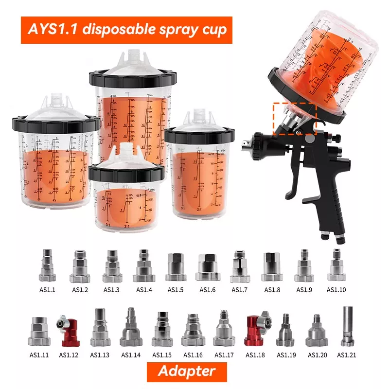 Der Einweg-Sprühbecher AYS1.1 ist mit dem Adapter der PPS1.0-Serie kompatibel. Mit dem Adapter lässt er sich perfekt an jede Spritzpistolenmarke anpassen und kann in jeder Position verwendet werden, ohne dass die Gefahr besteht, dass Farbe heruntertropft.