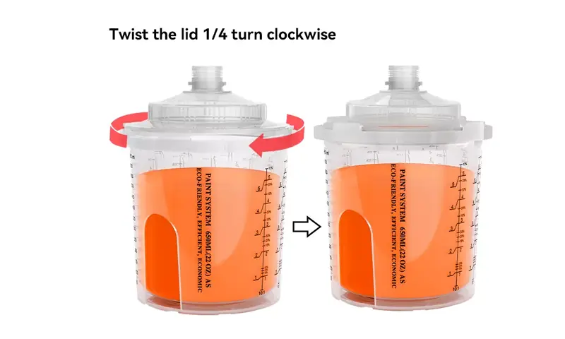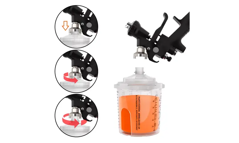 Wenn Sie das System entsperren, drücken Sie zunächst die Waffe nach unten und drehen Sie es gegen den Uhrzeigersinn, bis der Adapter frei ist. Zweitens wechseln Sie weiter, bis der Deckel völlig frei von den Schlössern der Außenbecher ist, und dann die Sprühpistole abzusetzen.
