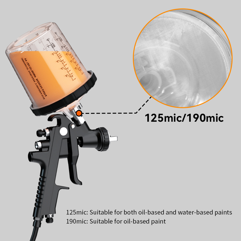 • Eingebaute integrierte Filter für ein hervorragendes Lackfinish: Der Einweg-Sprühbecherdeckel verfügt über integrierte 190μ-Filter (Ölfarbe) und 125μ-Filter (Wasserbasisfarbe), die Verunreinigungen beim Sprühen effektiv filtern und den Glanz der Farbe um 20 % erhöhen.